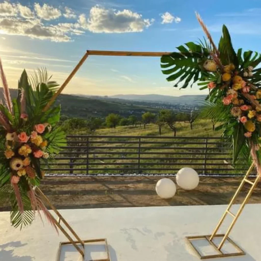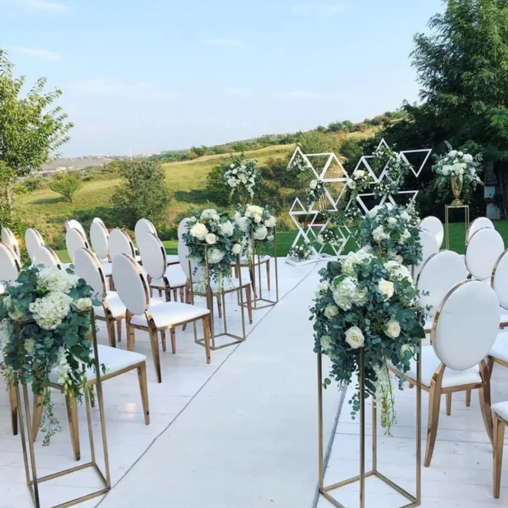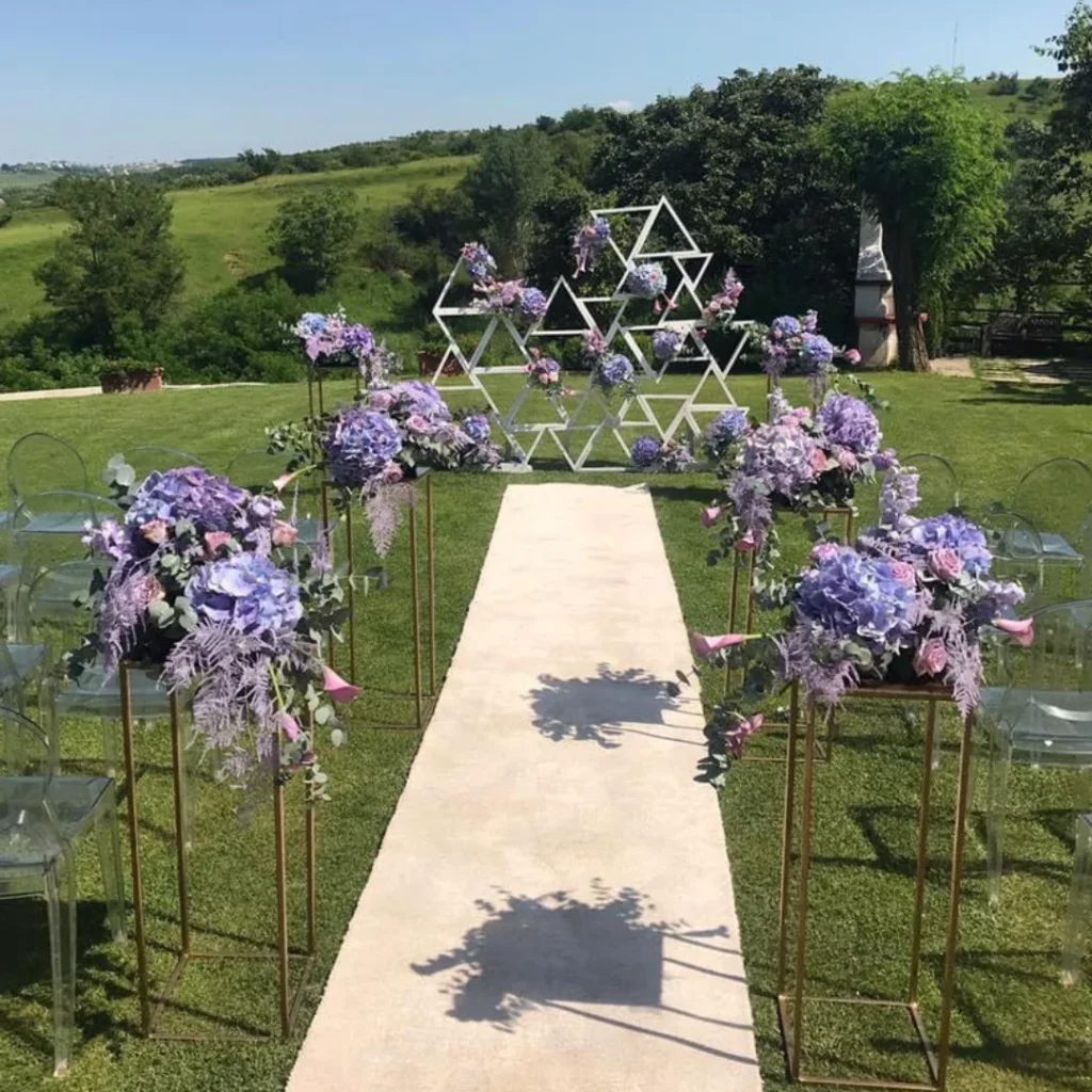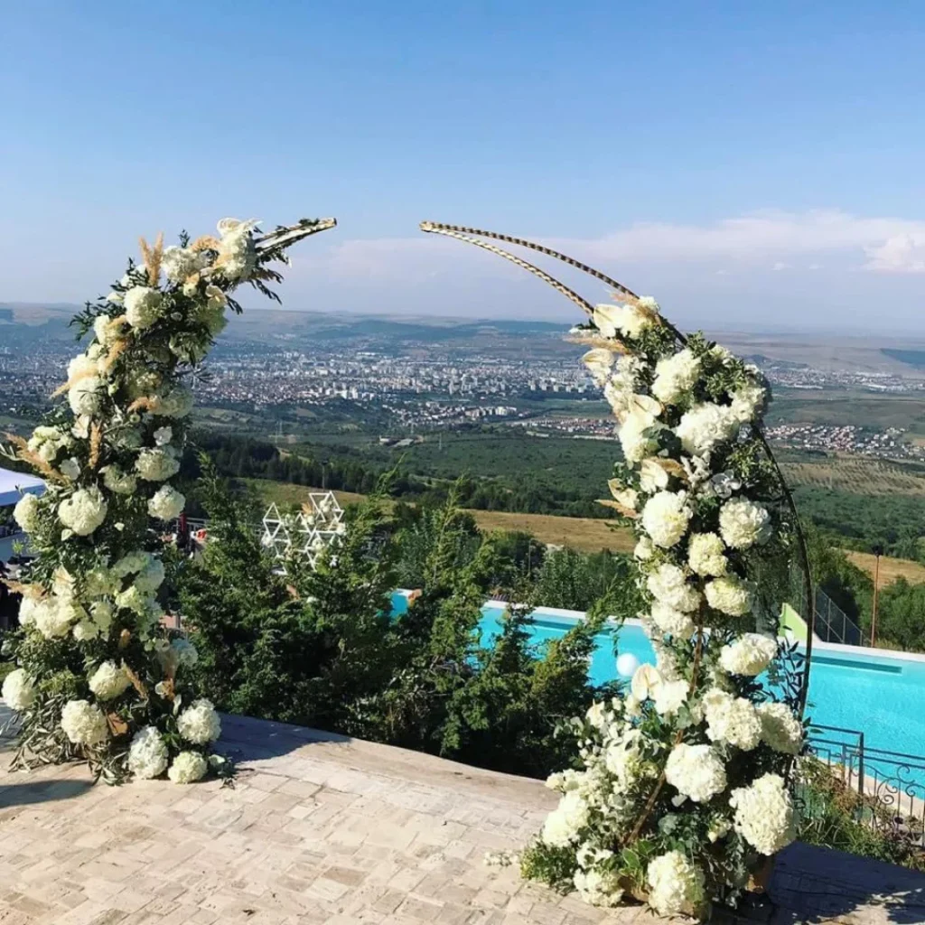 Dacă evenimentul vostru se desfășoară în aer liber, atunci puteți alege aranjamente florale care să intensifice și mai tare momentele pe care urmează să le trăiți acolo. Fie că optați pentru aranjamente supradimensioante sau, poate ceva care să nu iasă atât de tare în evidență, această idee va face ca locul să fie mult mai spectaculos, iar invitații să se bucure atât de ceea ce se întâmplă acolo, cât și de peisajul superb. Pe lângă acestea, exact în locul în care urmează să vă cununați, puteți alege o arcadă florală care să completeze întreg decorul.