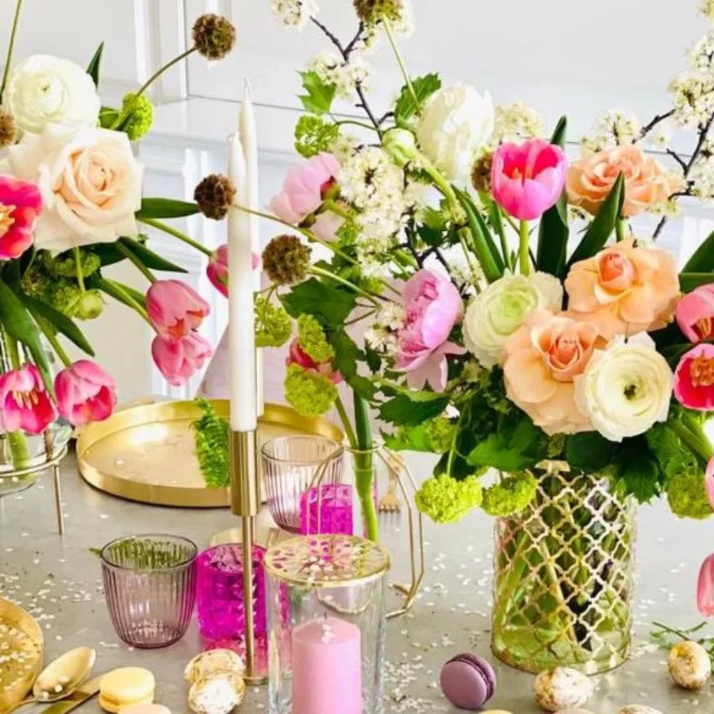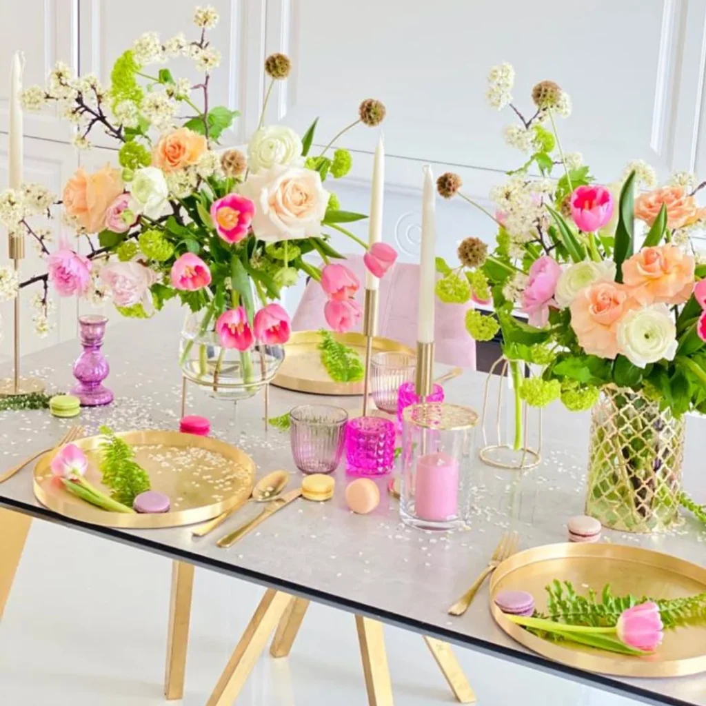 De această dată, piesa principală din centrul mesei va fi un aranjament din flori naturale colorat, plin de viață, cu un parfum fermecător ce va crea o ambianță plăcută în întreaga casă. Mai mult decât atât, poți completa întregul decor și cu alte 2-3 buchete de flori care să ofere continuitate.