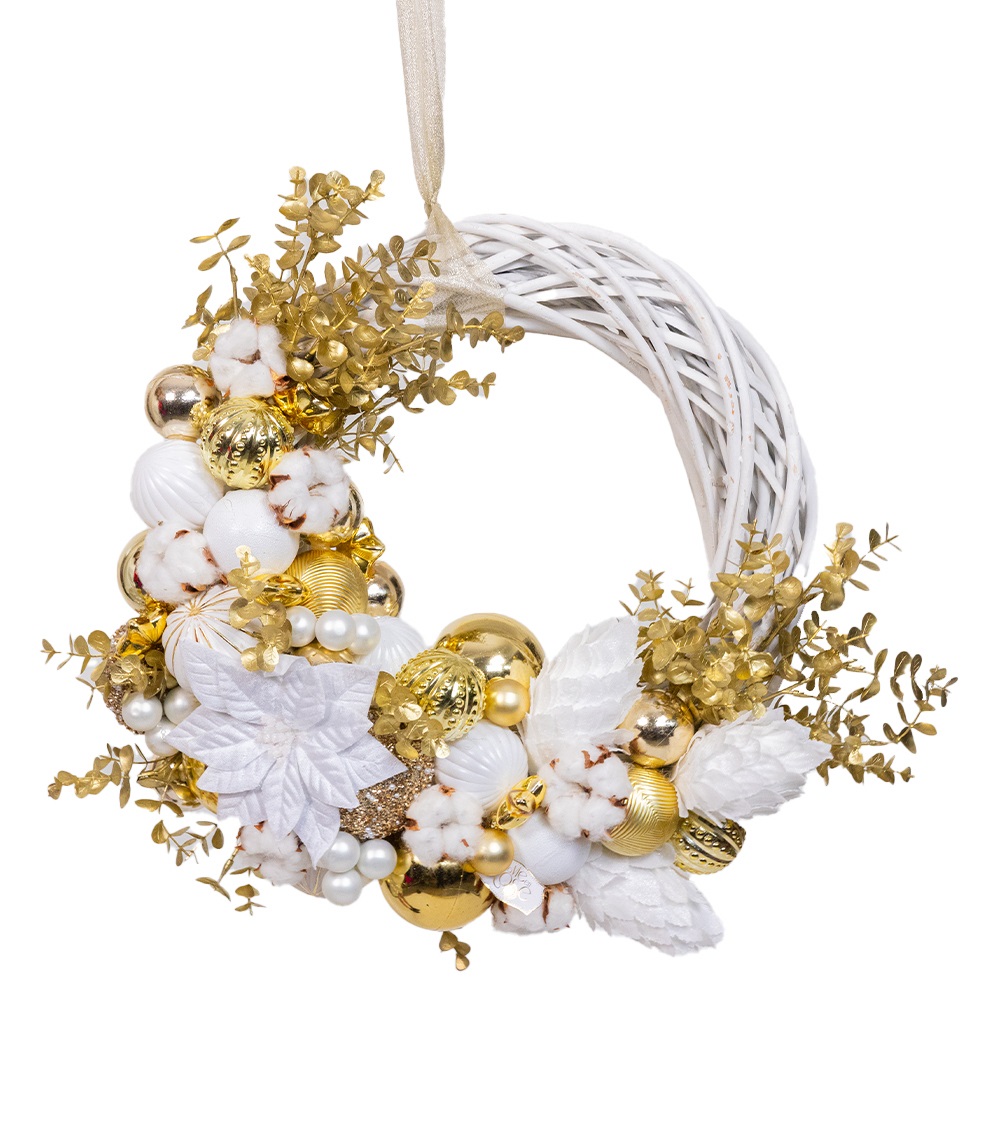 Accesorii de iarnă în alb și auriu: Coroniță de Ușă pentru Crăciun – Champagne Christmas este împodobită cu accesorii de iarnă în nuanțe de alb și auriu, care adaugă un plus de strălucire și festivitate. De la fulgi de zăpadă strălucitori la mici elemente aurii, fiecare detaliu este ales cu grijă pentru a completa frumusețea coroniței.