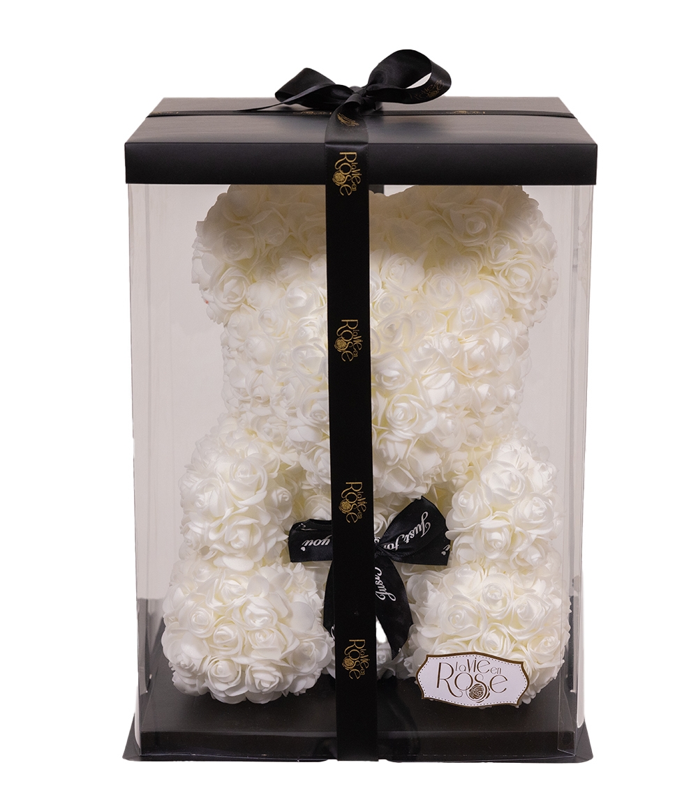Ursuleț din trandafiri alb, sugestie: Completează comanda ta florală cu un cadou: o cutie de ciocolată, o sticlă de vin sau șampanie, cu siguranta acestea vor face din comanda ta un cadou complet și de neuitat.