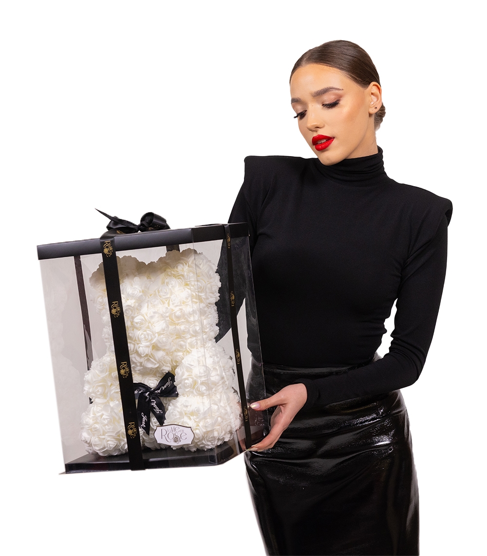 Trandafirul este un simbol al frumuseții și eleganței, cei albi fiind asociați de cele mai multe ori cu puritatea. Acest buchet vorbește despre iubire, pasiune și putere, despre atracție și amintiri de neuitat alături de jumătatea ta. Un ursuleț din trandafiri alb este un aranjament nou, jucăuș, care nu va dezamăgi. Chiar dacă nu se regăsesc printre florile preferate ale iubitei tale, trandafirii sunt pregătiți mereu să surprindă cel mai frumos zâmbet pe chipul jumătății tale și să vorbească în locul tău, atunci când cuvintele sunt de prisos.